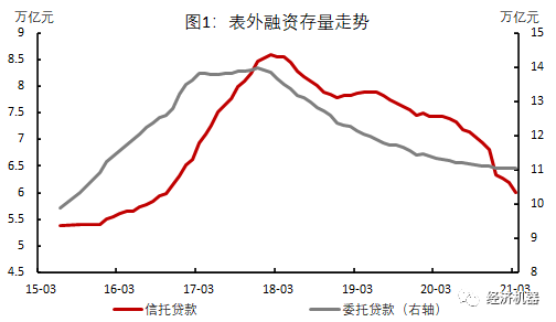 第一季度新增社會融資總額中,人民幣貸款占比達(dá)到77.3%,同比高12個百分點。作為表外融資,委托貸款和信托貸款第一季度凈減少3619元,比上年同期多減少4359億元。從兩者存量同比增速看,3月份分別同比下降2.8%和19.2%,總量均呈繼續(xù)下降趨勢(圖1),表明壓縮表外融資的大趨勢仍在繼續(xù)。第一季度直接融資(企業(yè)債券+股票+政府債券+ABS)合計新增17938億元,較上年同期大幅下降16659億元,主要與地方專項債發(fā)行節(jié)奏相對放緩和縮減有關(guān)。