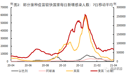經(jīng)濟(jì)復(fù)蘇勢頭強勁,既與“就地過年”、復(fù)工復(fù)產(chǎn)較快有關(guān),也與國內(nèi)外疫情持續(xù)改善有關(guān)。過去一段時間,各國開始進(jìn)入疫苗接種階段。海外國家中,美國、以色列、阿聯(lián)酋、英國等疫苗接種最為迅速,感染人數(shù)也出現(xiàn)了明顯的下降態(tài)勢(見圖2)。疫情改善帶動了海外經(jīng)濟(jì)的復(fù)蘇,對我國外需產(chǎn)生明顯拉動作用。年初以來,美、德、日、韓等主要經(jīng)濟(jì)體進(jìn)口增速同比均已轉(zhuǎn)正,大部分已出現(xiàn)兩位數(shù)正增長。此外,美國近期通過了1.9萬億美元的刺激法案,也將強化我國外需復(fù)蘇的持續(xù)性。疫情改善疊加經(jīng)濟(jì)刺激,國際組織持續(xù)向上修正對美國及海外國家2021年經(jīng)濟(jì)增速預(yù)測,2021年我國外貿(mào)大環(huán)境整體上仍將處于有利狀態(tài)。