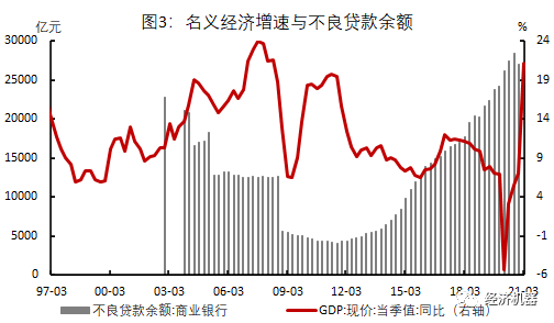 中外無數(shù)案例表明,經(jīng)濟(jì)增長與減債力度節(jié)奏之間關(guān)系處理得好,宏觀杠桿率就能穩(wěn)住甚至下降;反之,盲目舉債刺激增長,或者勒緊褲腰帶緊縮犧牲增長,都會導(dǎo)致去杠桿的失敗。20世紀(jì)90年代的日本和21世紀(jì)初的希臘,都因為過于注重緊縮而導(dǎo)致經(jīng)濟(jì)衰退,從而使去杠桿進(jìn)程遭遇失敗。反之,中國在1998年期間積極擴(kuò)大內(nèi)需,刺激三駕馬車,全力保增長,使經(jīng)濟(jì)從1993~1998年的整頓和衰退中迅速走出來,開始了新一輪經(jīng)濟(jì)景氣周期;同時積極進(jìn)行改革,擴(kuò)大開放,包括外匯儲備注資和剝離壞賬,國企改革和積極加入WTO等。結(jié)構(gòu)層面,改革開放動作有效釋放了增長潛力;總量層面,總需求不斷擴(kuò)大,反通縮取得決定性勝利。兩者共振,使一度“資不抵債”的國有大行在壞賬絕對水平和壞賬率兩方面,均出現(xiàn)了明顯下降(圖3),成為了去杠桿的典范。