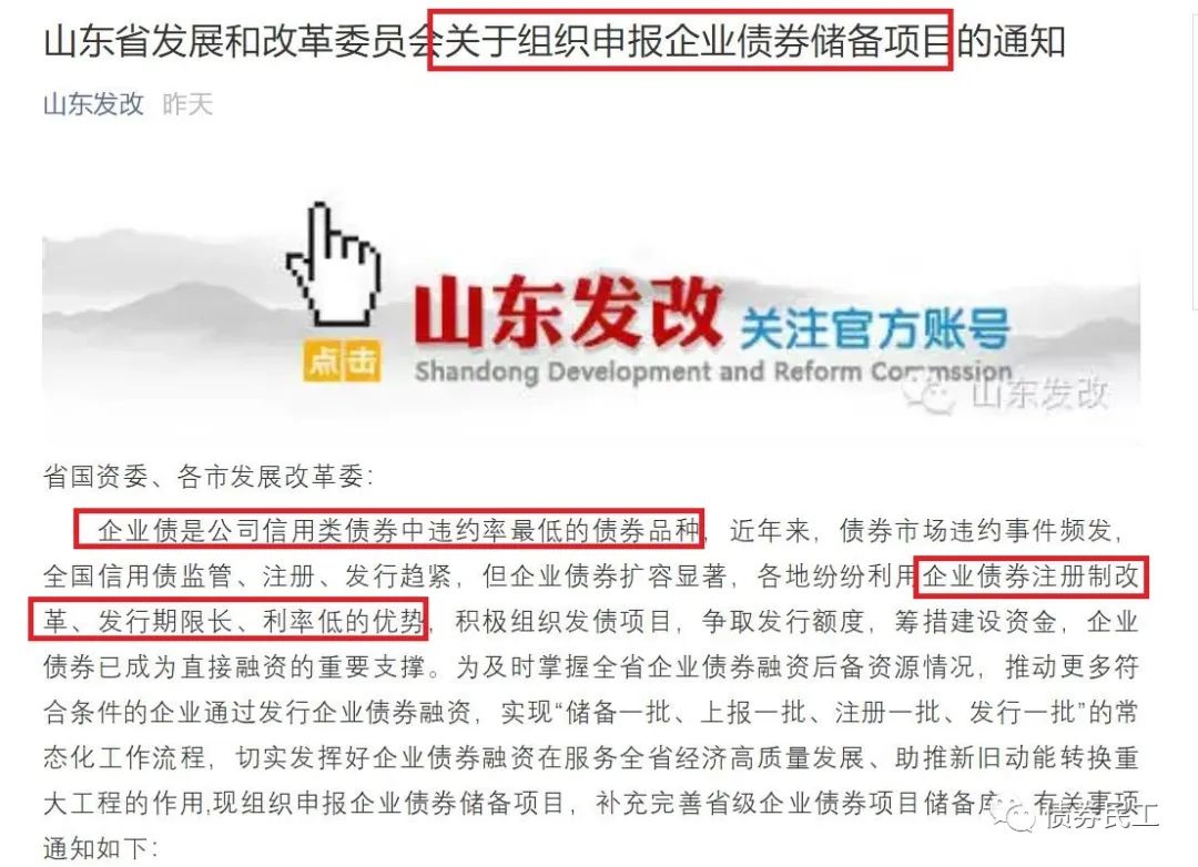 山東省發(fā)改委于2021年11月9日印發(fā)的《關(guān)于組織申報(bào)企業(yè)債券儲備項(xiàng)目的通知》直接在債券民工的朋友圈刷屏了,明確提出“企業(yè)債券是違約率最低的債券品種”,具備“注冊制改革、發(fā)行期限長、利率低”的優(yōu)勢。