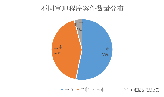 如圖1-3所示,公開檢索的裁判文書一審案件65件,占比53%,二審案件52件,占比43%,再審案件5件,占比5%。