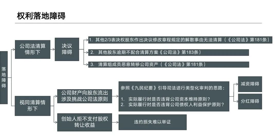 但是,同上文探討一票否決權落地效果的邏輯一致,在探究完畢其條款法律效力現狀后,我們仍然進一步總結了目前優先清算權實現過程中存在的實際障礙與可能的救濟路徑: