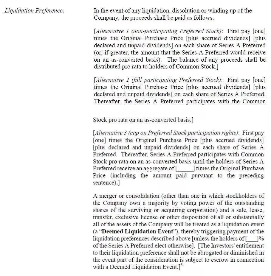 優先清算權條款指投資方在目標企業清算(終止、解散)或發生視同清算的情形(公司的“資產變現事件”)或結束業務時,具有的優先于其他普通股股東獲得分配的權利。其中文常見示范文本如下: