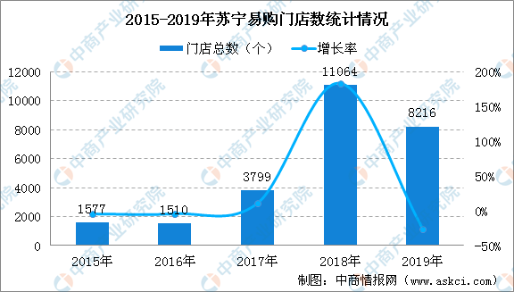 馬云的“新零售”原本計劃帶飛蘇寧的“智慧零售”。在合作后,蘇寧也的確一度將門店數量擴增了300%,兩年間新開了9554家線下店。