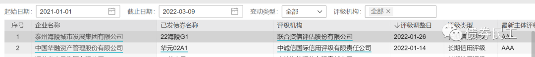 根據(jù)wind資訊的統(tǒng)計數(shù)據(jù),2022年1月1日至3月9日,國內(nèi)信用債券市場上債券發(fā)行人評級正面變動的只有兩例。其中,華融資產(chǎn)為評級負面調(diào)整為正面,主體信用等級調(diào)升的只有泰州海陵城市發(fā)展集團有限公司,主體信用等級由AA調(diào)升至AA+。