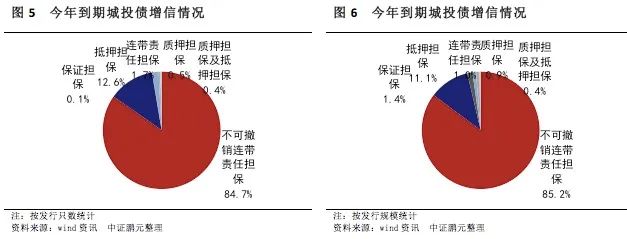 從增信情況來看,到期城投債中有819只為擔保債券,占到期城投債之比為12.95%,反映出大部分城投債沒有增信措施。其中,含有不可撤銷連帶責任擔保的債券694只,占含有增信措施城投債之比為84.7%,占據主導地位;連帶責任擔保債券14只,占比1.7%;保證擔保債券1只,占比0.1%;抵押擔保債券103只,占比12.6%;質押擔保債券4只,占比0.5%;質押擔保及抵押擔保債券3只,占比0.4%。