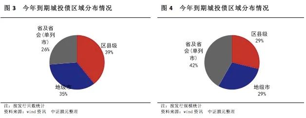 2021年到期城投債行政級別分布來看,區縣級城投到期債券只數和規模分別為2481只和11464.86億元,占比分別為39.24%和28.87%,分別同比上升49.91%和67.56%;地級市城投到期債券只數和規模分別為2180只和11630.28億元,占比分別為34.48%和29.28%,分別同比上升44.66%和62.74%;省及省會城投到期債券只數和規模分別為1661只和16619.38億元,占比分別為26.27%和41.85%,分別同比上升53.94%和59.25%。一般而言,城投債風險隨行政級別的上升而下降,今年城投債到期規模呈現逐級遞增態勢,城投債信用風險總體可控。