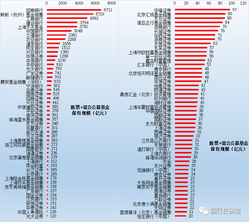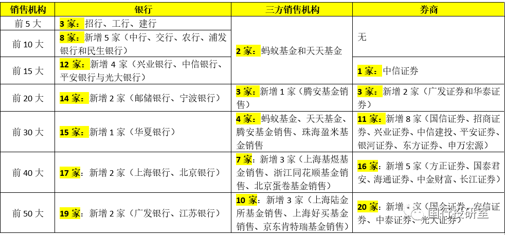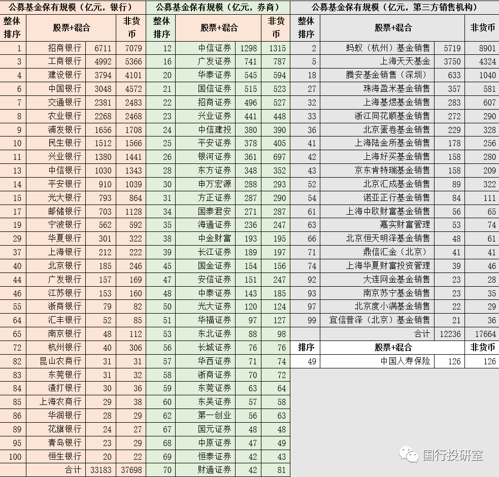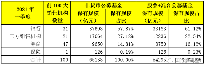 一、前100大公募基金銷售機構:銀行31家、券商47家、三方銷售機構21家