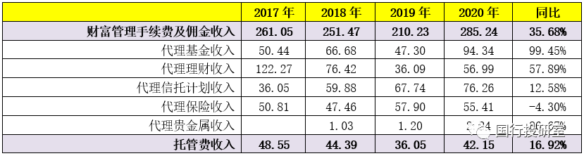 以招行為例,2020年招行財富管理業務貢獻的中收規模達到285.24億元,同比大幅增長35.68%。其中,代理基金、代理理財、代理信托實現的收入分別高達94.34億元、56.99億元和76.26億元,同比分別增加99.45%、57.89%和12.58%。