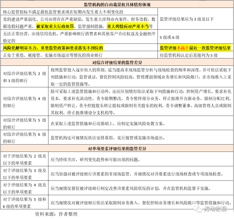 (5)監管機構可根據評級結果的差異,采取不同的監管舉措,一般根據評級檔次的高低,按照監管投入逐步加大的原則,適當提高監管力度。目前來看,只有評級結果為1級的銀行,才可以豁免相應監管。