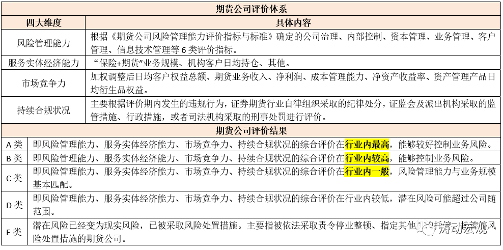 2、證監會主要根據2019年2月15日修訂的《期貨公司分類監管規定》(證監會(2019)第5號公告),對期貨公司進行評級,事實上這一文件最早于2011年4月12日公布。同時,期貨公司的評價標準仍以風險管理與控制能力為基礎,主要依據《期貨公司風險管理能力評價指標與標準》。