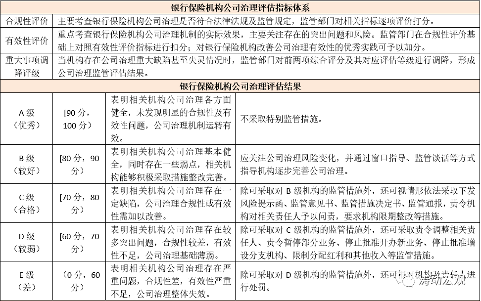 1、對銀行保險機構公司治理的監管評估主要依據2019年11月29日銀保監會發布的《銀行保險機構公司治理監管評估辦法(試行)》(銀保監發〔2019〕43號),該評級主要針對全國性銀行、城商行、民營銀行、農商行、外資銀行、保險集團(控股)公司、保險公司、相互保險社及自保公司,評估內容主要包括黨的領導、股東治理、董事會治理、監事會和高管層治理、風險內控、關聯交易治理、市場約束、其他利益相關者治理等方面。