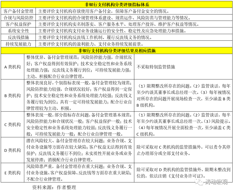 2、央行根據支付機構的評價計分及相關特殊情況將支付機構分為A(從A至AAA)、B(從B至BBB)、C(從C至CCC)、D、E共5類11級。