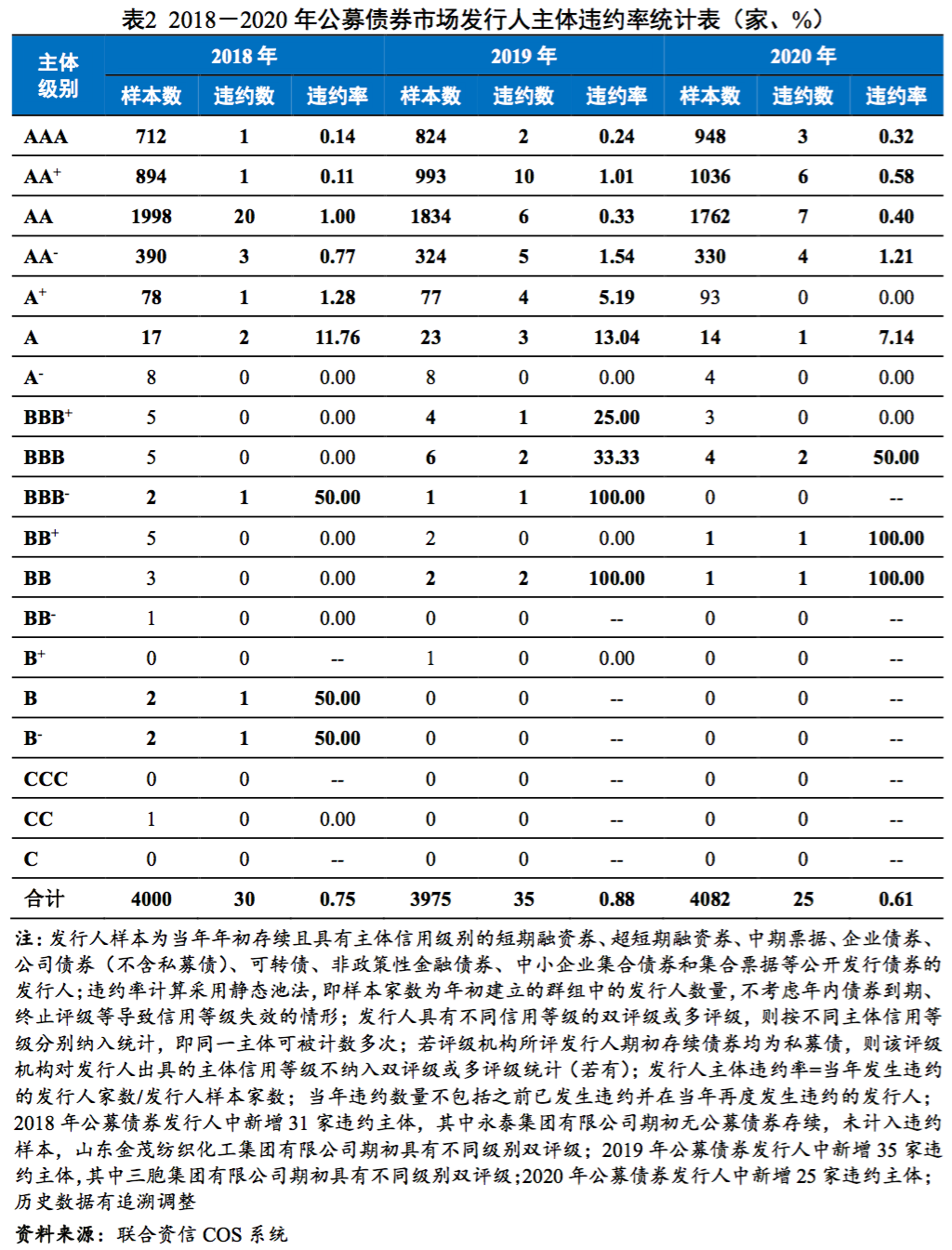 本文從違約情況、等級調整與等級遷移、利差表現三方面對2020年我國債券市場評級表現進行分析并對評級質量進行檢驗。整體看,2020年我國債券市場整體平穩運行但穩中有變,違約常態化背景下信用風險超預期釋放,部分高級別主體違約事件對市場情緒造成一定沖擊,但信用風險整體仍處于可控狀態。