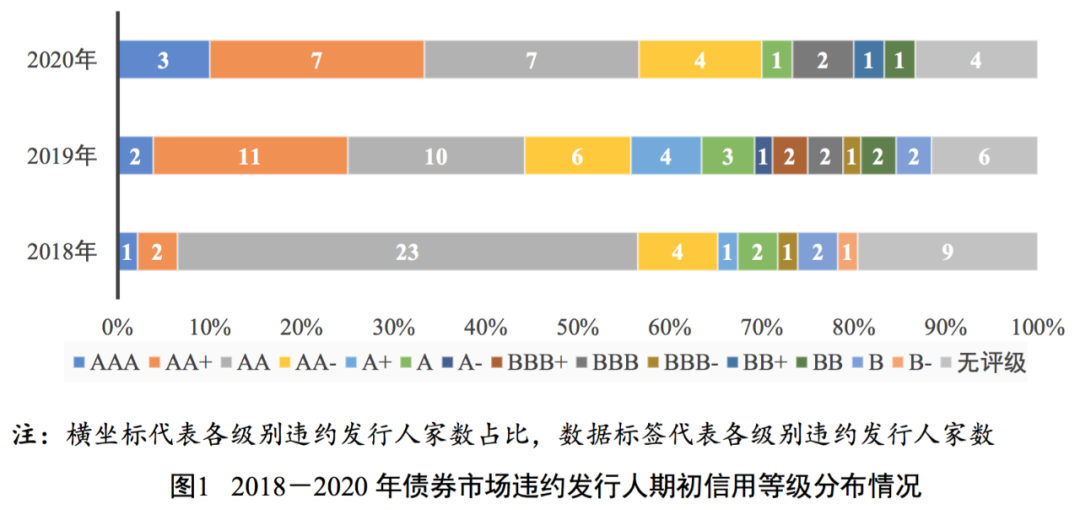 違約發行人期初信用等級分布方面,2020年我國債券市場新增違約發行人期初信用等級分布在AAA級至BB級,其中AA+級和AA級發行人數量較多(各7家);高級別(AAA級和AA+級)發行人占比(33.33%)較2019年(25.00%)和2018年(6.52%)均有所上升。