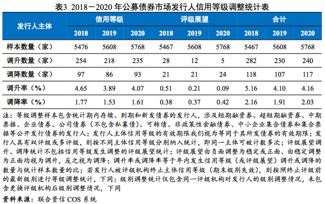 2020年,公募債券市場上共有328家發行主體信用等級發生調整,調整率為5.69%,較2019年(5.42%)上升0.27個百分點,較2018年(6.42%)下降0.73個百分點。其中信用等級被調升的發行人有235家,調升率為4.07%,較2019年(3.89%)上升0.18個百分點,較2018年(4.65%)下降0.58個百分點;信用等級被調降的發行人有93家,調降率為1.61%,較2019年(1.53%)上升0.08個百分點,較2018年(1.77%)下降0.16個百分點。整體來看,2020年公募債券市場信用等級調整率較2019年和2018年變化不大,整體仍呈調升趨勢。