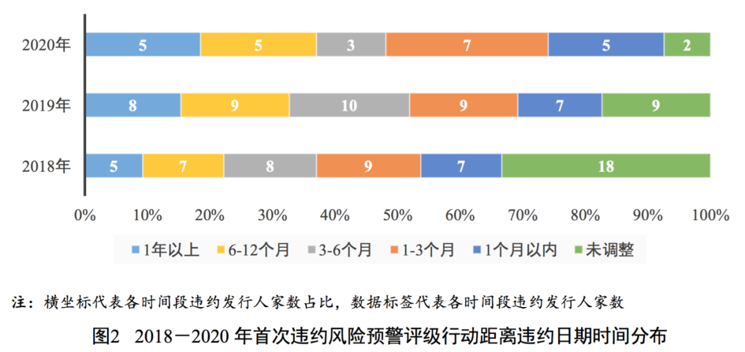 2020年我國債券市場30家新增違約發行人中有24家在違約前具有有效信用等級,多數違約事件發生前評級機構通過各類評級行動進行了風險預警[6],首次違約風險預警評級行動日期距離違約日期時間在1個月以內的有5家,1~3個月(含)的有7家,3~6個月(含)的有3家,6~12個月(含)的有5家,1年以上的有5家。整體來看,評級機構對違約發行人提前6個月、提前1年進行風險預警的比例較2019年和2018年均有所上升,信用風險預警能力有所改善,但預警及時性仍有待提高。