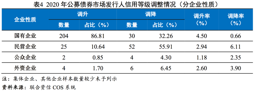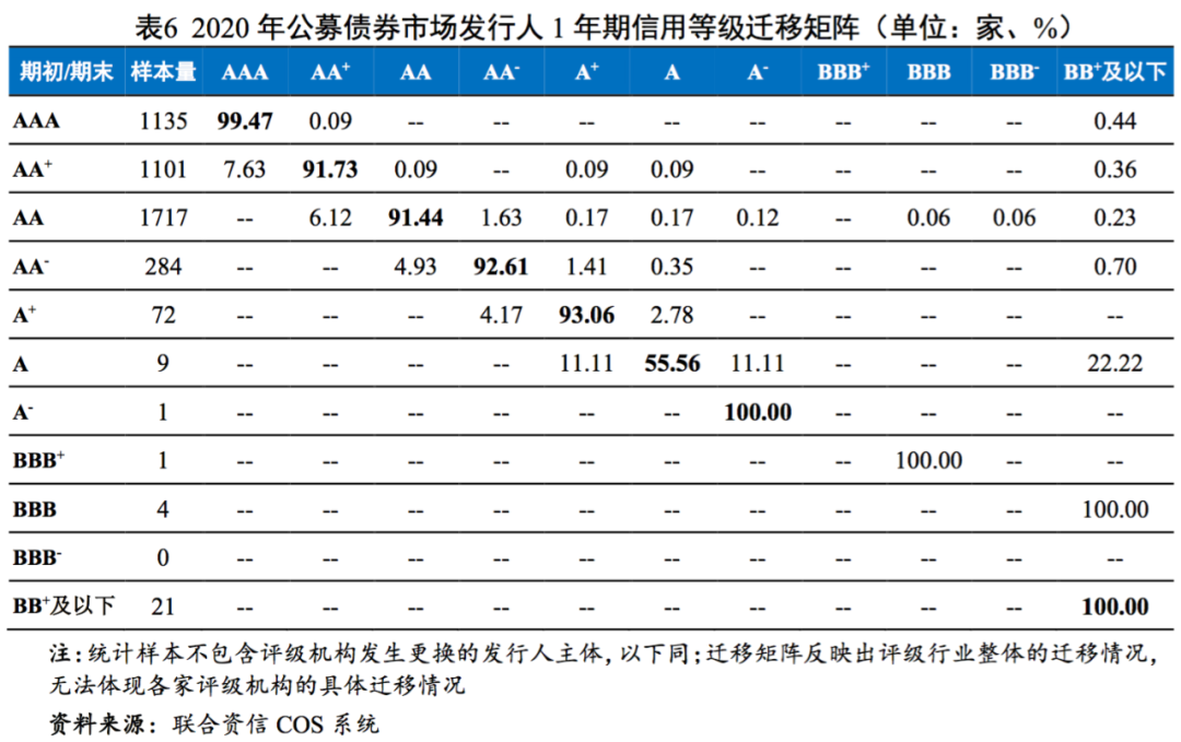 等級調整方面,發行人信用等級調整率變化不大,整體仍呈調升趨勢;企業性質方面,國有企業調整率同比上升,民營企業調整率同比下降,弱資質民營企業信用風險持續出清,存量發行人整體信用狀況有所改善,而國有企業信用風險出現一定程度分化,部分國有企業違約風險開始暴露;行業和地區方面,部分行業信用風險出現分化,等級調整無明顯地域特征;此外,大跨度評級調整數量有所減少。信用等級遷移方面,截至2020年末AAA級、AA+級發行人占比進一步上升,各級別穩定性整體表現良好,AA+級至A+級呈向上遷移趨勢。