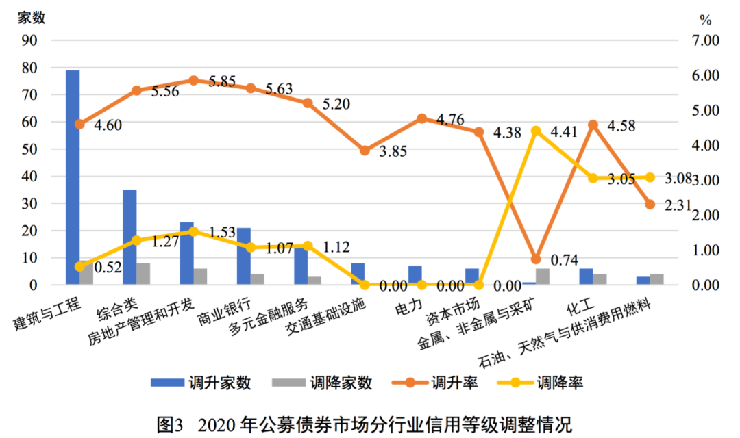 行業分布方面,在樣本數量相對較多(發行主體家數超過100家,下同)的行業中,建筑與工程(79家)、綜合類(35家)、房地產管理和開發(23家)、商業銀行(21家)、多元金融服務(14家)等行業[7]的發行人信用等級被調升的數量相對較多;信用等級被調降的發行人則主要分布在建筑與工程(9家)、綜合類(8家)、房地產管理和開發(6家)、金屬、非金屬與采礦(6家)等行業;房地產管理和開發行業的調升率最高(5.85%),金屬、非金屬與采礦行業的調降率最高(4.41%);化工行業、石油、天然氣與供消費用燃料行業的調升率和調降率均較高,行業內發行人信用風險出現分化現象。