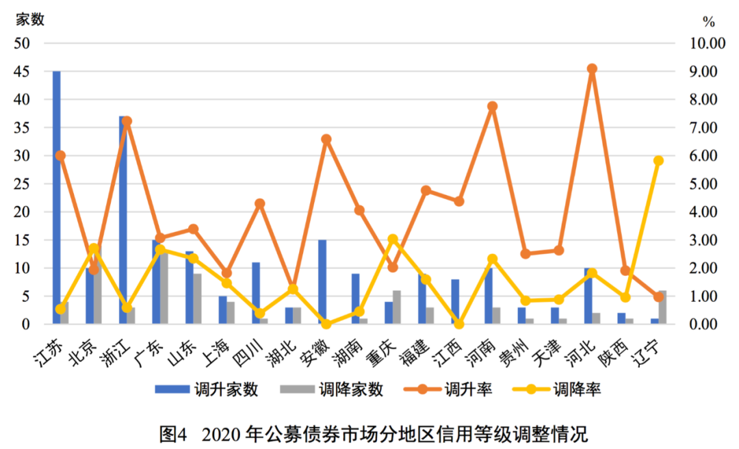 地區分布方面,在樣本數量相對較多的地區中,江蘇(45家)、浙江(37家)、安徽(15家)、廣東(5家)、山東(13家)、四川(11家)等地發行人信用等級被調升的數量相對較多,北京(14家)、廣東(13家)、山東(9家)、重慶(6家)、遼寧(6家)等地發行人信用等級被調降的數量相對較多;河北發行人的調升率最高(9.09%),遼寧發行人的調降率最高(5.83%)。整體來看,信用等級發生調整的發行人地域分布相對分散,未呈現出明顯特征。