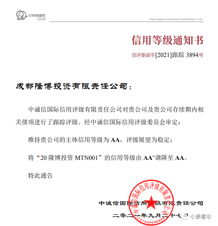 9月28日,中誠信國際公告稱,維持成都隆博投資有限責任公司(以下簡稱“隆博投資”)的主體信用等級為AA,評級展望為穩(wěn)定,將“20隆博投資MTN001”的信用等級由AA+調降至AA。