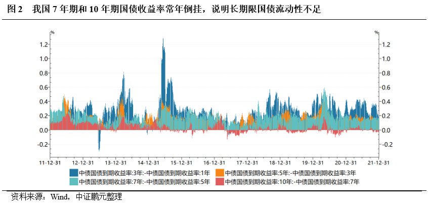 定價機制是金融市場資源配置的基石。成熟的定價機制能動態(tài)匹配風(fēng)險與收益、引導(dǎo)資金合理流動、提升資源的配置效率;而扭曲的定價機制損害資源配置效率、劣幣驅(qū)逐良幣,時間長久后易積累成系統(tǒng)性風(fēng)險,影響經(jīng)濟健康發(fā)展。目前我國信用債券定價機制有如下幾個突出問題:一是缺乏權(quán)威基準(zhǔn)利率,國債收益率作為使用最為廣泛的基礎(chǔ)利率,尚存在因長期限國債流動性不足而長短端利率倒掛(圖2)等問題,這不利于我國信用債券的定價、特別是長期限債券的定價;二是債券市場的分割導(dǎo)致定價機制不統(tǒng)一,企業(yè)融資利率一定程度上取決于渠道而非真實信用水平,從而形成渠道套利空間;三是常年形成的依賴土地等抵押品和政府信用的潛在風(fēng)險定價因素,使得風(fēng)險溢價水平與企業(yè)自身經(jīng)營風(fēng)險關(guān)聯(lián)性較弱。此外,定價系統(tǒng)的基礎(chǔ)設(shè)施建設(shè)也不足,銀行間、交易所市場要加強互聯(lián)互通,各機構(gòu)也要逐步構(gòu)建自身的收益率曲線與定價估值系統(tǒng),建立健全自主定價報價流程和機制,全方位立體構(gòu)建我國信用債券的定價體系。2022年1月20日,銀行間和交易所聯(lián)合發(fā)布《銀行間債券市場與交易所債券市場互聯(lián)互通業(yè)務(wù)暫行辦法》,為打通我國常年割裂的兩個交易市場邁出了實質(zhì)性的一大步。