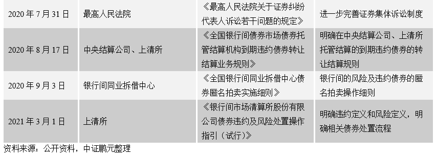 二是完善相關(guān)法律法規(guī)的建設(shè)。《公司法》和《證券法》構(gòu)成我國信用債券市場的基礎(chǔ)法律。近年隨著違約事件的頻發(fā),違約處置相關(guān)的法規(guī)制度也在加速制定中,從法律定義、行政監(jiān)管以及實際操作規(guī)范三個層次,搭建違約處置的基本框架(表1)。后續(xù)仍需在加強債券市場互通互聯(lián)、完善破產(chǎn)人管理制度、加大執(zhí)法力度等方面繼續(xù)努力。