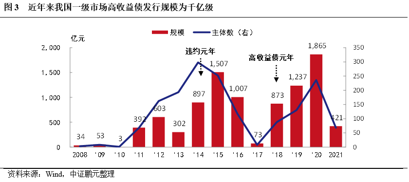 市場上通常將發(fā)行利差(票面利率與發(fā)行當(dāng)日同期限國債收益率之差)>500BP的債券認(rèn)定為高收益?zhèn)瑩?jù)此測算,當(dāng)前我國高收益?zhèn)臧l(fā)行規(guī)模約為千億級(圖3),2021年因為高收益?zhèn)闹饕l(fā)行行業(yè)之一的房地產(chǎn)信用風(fēng)險集中爆發(fā),融資規(guī)模急劇收縮,因而2021年的高收益?zhèn)l(fā)行規(guī)模同比大幅下降。