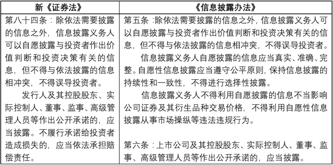 公開承諾披露是對自愿披露的限制,一旦公開承諾,該承諾內(nèi)容便成為特殊的強制披露內(nèi)容,不再屬于自愿披露內(nèi)容。[9]由此新《證券法》第八十四條第二款和《信息披露辦法》第六款新增了公開承諾披露制度。承諾人不履行承諾給投資者造成損失的,依法承擔賠償責任。
