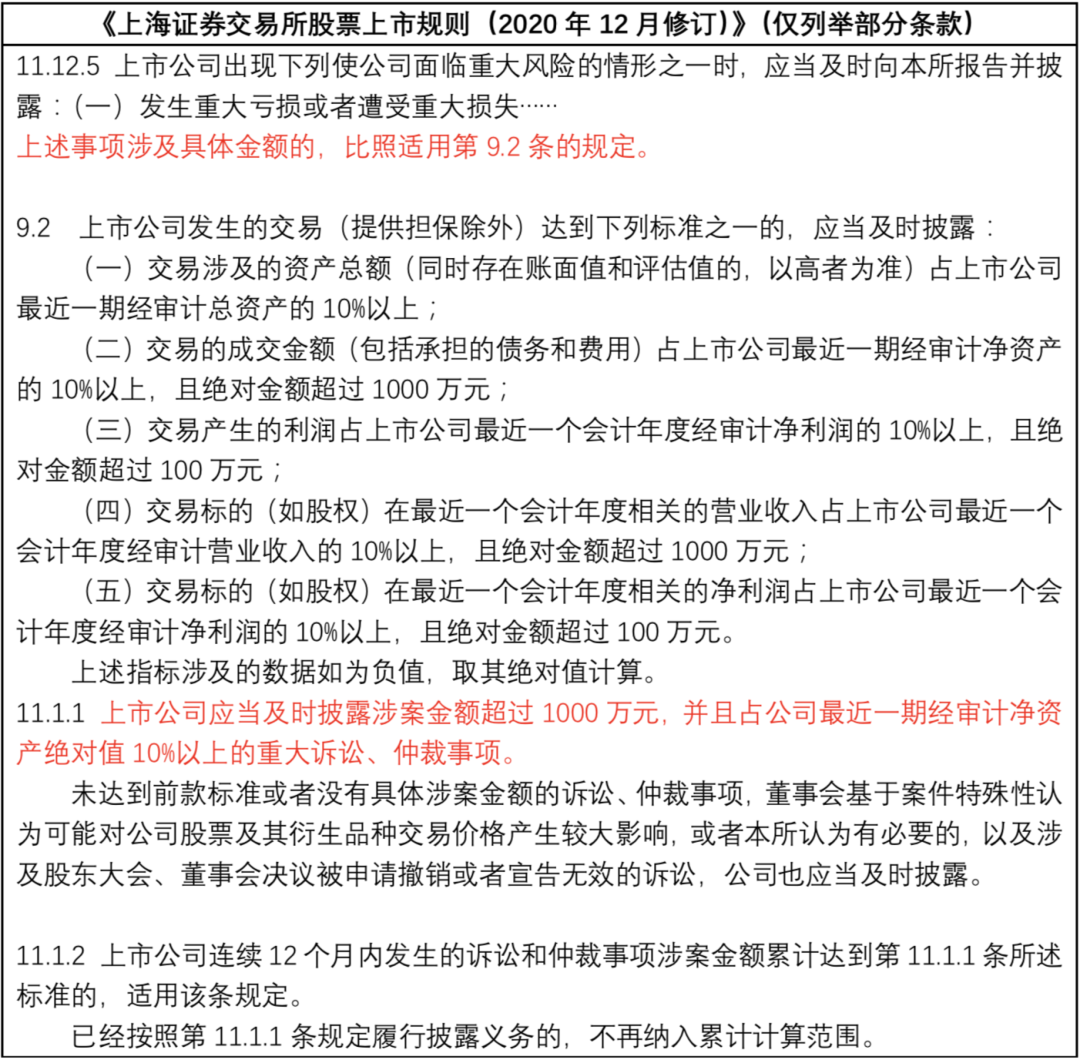 對于公司發(fā)生重大債務和未能清償?shù)狡谥卮髠鶆盏倪`約情況、涉及重大訴訟或仲裁等具體達到何種金額才能構(gòu)成重大事件應當予以披露,交易所的相關(guān)規(guī)則有明確規(guī)定,以《上海證券交易所股票上市規(guī)則(2020年12月修訂)》為例: