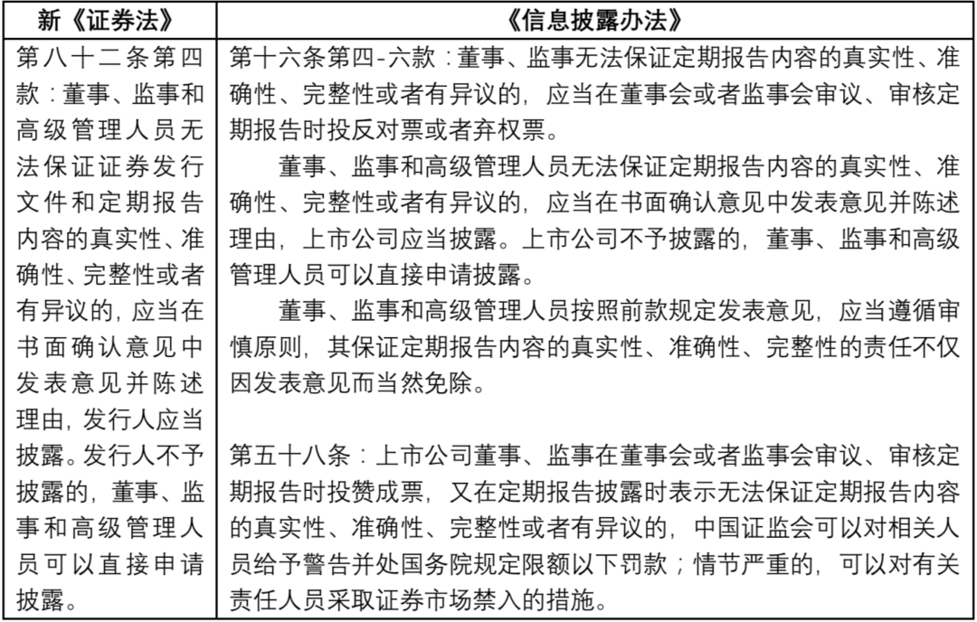 考慮到發(fā)行人董監(jiān)高較高的職業(yè)風險和權(quán)限范圍,基于保障董監(jiān)高合法權(quán)益,新《證券法》第八十二條第四款,在《上市公司信息披露管理辦法(2007年)》第二十四條第二款等規(guī)定基礎之上,新增了董監(jiān)高的信息披露異議制度,即董監(jiān)高在無法保證發(fā)行文件和定期報告內(nèi)容真實、準確、完整或存在異議時,應當書面確認意見并陳述理由,發(fā)行人應予披露,發(fā)行人不披露的,董監(jiān)高可申請披露。董監(jiān)高異議披露制度也是發(fā)現(xiàn)證券市場虛假陳述等違法行為的有效措施之一。[12]