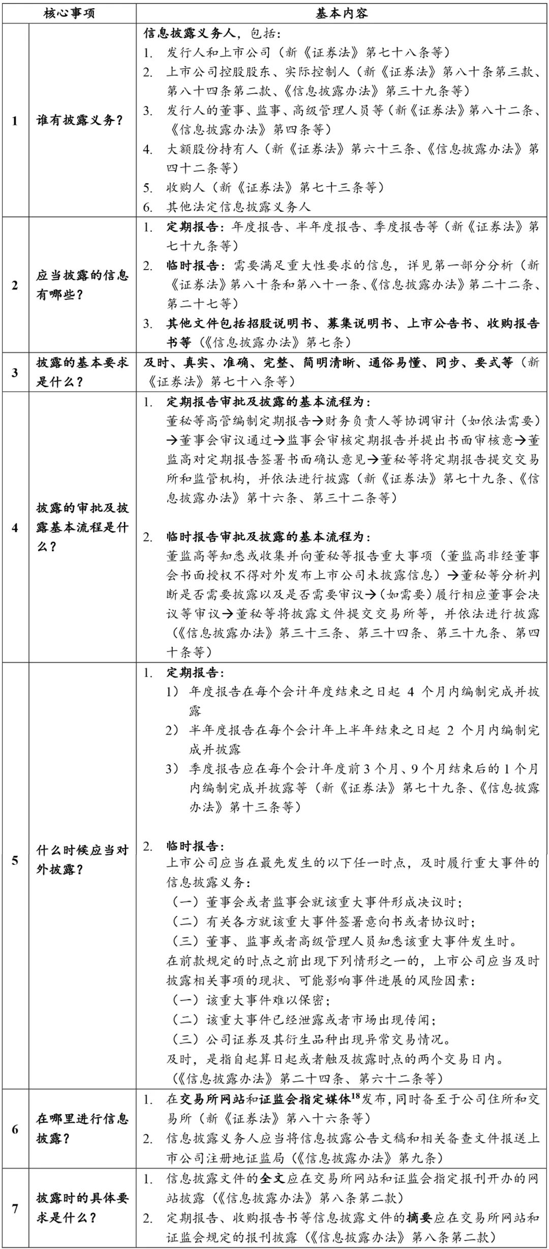 根據(jù)新《證券法》、《信息披露辦法》、交易所相關(guān)規(guī)則等規(guī)定,就信息披露的義務主體、應披露的信息、披露基本要求、披露基本流程、披露時間點等,簡要歸納如下: