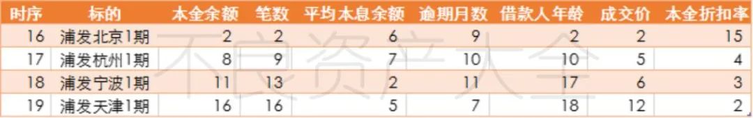 本月19-20日兩天,浦發(fā)銀行接連售出4期個貸不良資產(chǎn),共87戶207筆,總計未償本金約1,828萬元,賬齡介于2-3年之間,件均(本息合計)10萬元左右,均為消費貸,區(qū)域分別為京杭甬津,處置狀態(tài)除了天津1期的一部分標的均已起訴,大部分終本或執(zhí)行終結(jié)。