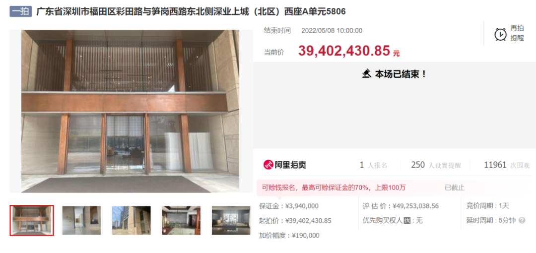 風財訊注意到,該豪宅為福田中心區深業上城一套467平商務公寓,為第一次拍賣,僅1人報名,最終以約3940萬的起拍價成交,較原登記價(約5530萬)打了7折。