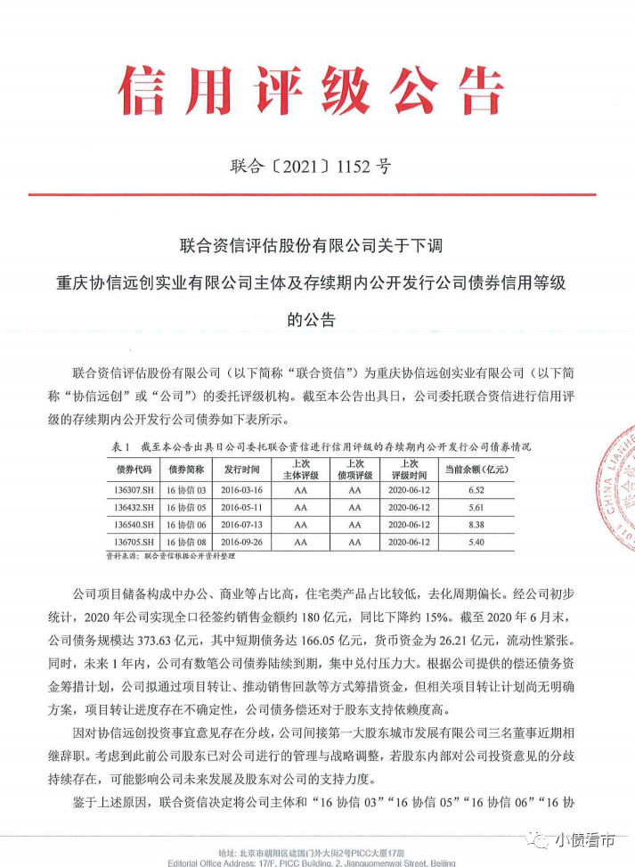 近日,聯(lián)合資信公告稱,將重慶協(xié)信遠(yuǎn)創(chuàng)實業(yè)有限公司(以下簡稱“協(xié)信遠(yuǎn)創(chuàng)”)主體和“16協(xié)信03”、“16協(xié)信05”、“16協(xié)信06”、“16協(xié)信08”信用等級下調(diào)至AA-,并將其列入可能下調(diào)信用等級的評級觀察名單。