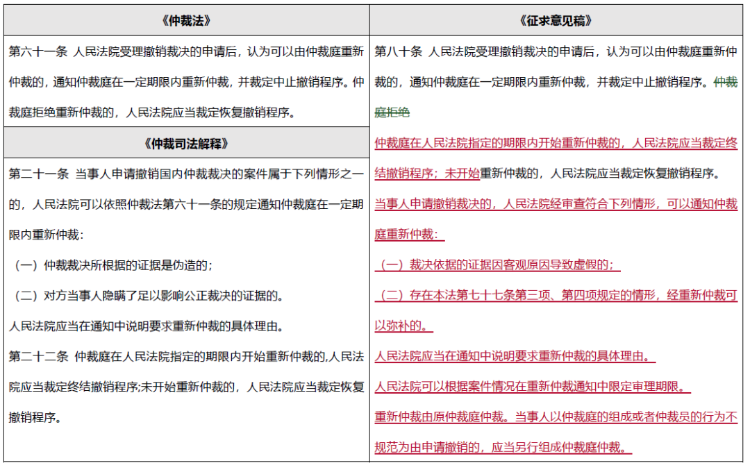 除撤銷仲裁裁決事項外, 《征求意見稿》對撤銷仲裁裁決案件中法院指定仲裁庭重新仲裁的情況進行了明確的規定。