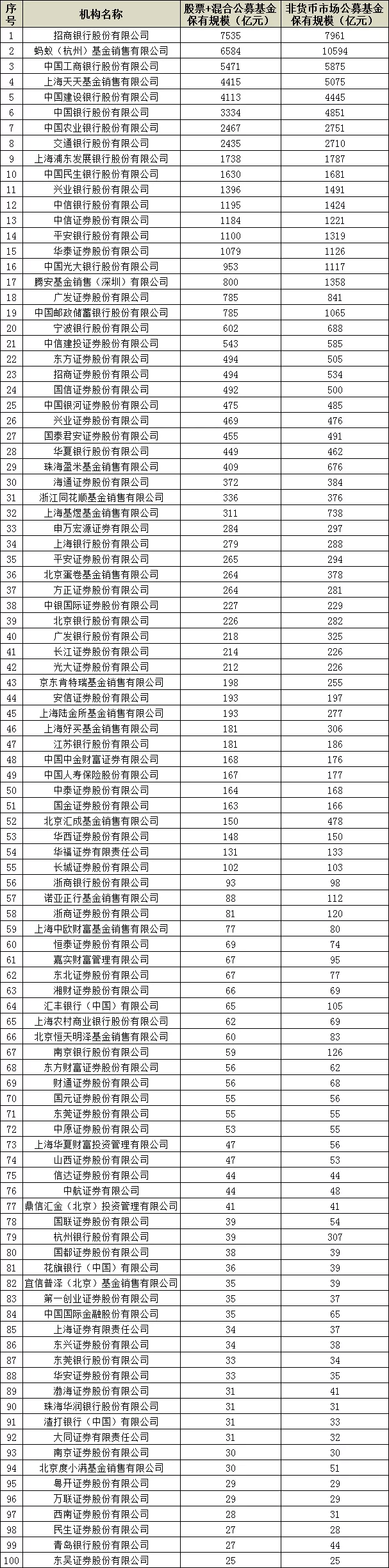 7月30日,中國基金業協會公布了2021年二季度末基金代銷機構保有量前百強機構。和一季度數據相比,頭部的十家機構地位穩固未有變化,只是名次上略微有所變動。