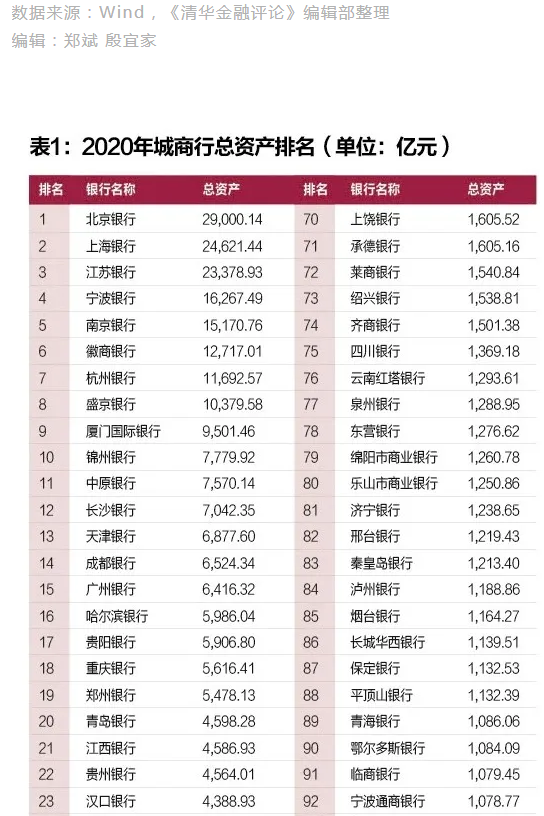 來自wind的數據顯示,截止到2020年12月31日,城商行總資產排名第一的是北京銀行,其資產總規模為29,000億元;依次往后為上海銀行,總資產為24,621億元;江蘇銀行,資產總規模為23,378億;寧波銀行排第四,資產總規模為16,267億元;南京銀行為15,170億元,杭州銀行為11,692億元。