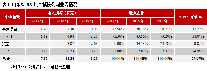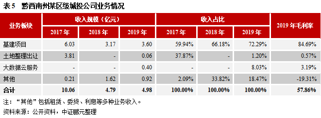 (3)業務情況:公司業務包括基建項目、土地整理出讓、大數據云服務等板塊,其中基建項目、土地整理出讓均為傳統城投業務,大數據云服務則屬市場化業務。除了上述三大業務板塊,公司還有一些其他的業務。2017-2019年其他業務收入分別為0.21億元、1.62億元、0.92億元,在總收入中的占比分別為2.09%、33.82%、18.47%,毛利率分別為96.00%、-4.54%、-19.31%(見表5)。根據公司披露的信息,來自于其他業務的收入中主要系由子公司鈞鵬建設的建筑施工所產生的,但2018年、2019年該業務產生的收入金額在其他業務收入中的占比均不足六成,而其余的收入系由哪些業務產生則無法得知。綜上可知,近兩年公司其他業務所產生的收入規模較大,僅次于基建項目,但其毛利率均為負數,且存在部分收入來源難以查明的情形。