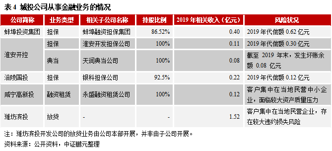 (4)風險提示:弱資質城投公司的業務經驗主要集中在基礎設施投融資領域和公用事業領域,其“原生”管理團隊不具備足夠的專業質素,以應對金融業務的經營運作和風險把控,存在較大的因決策失誤導致投資失敗的可能性。而且,即便是重金聘請職業經理人來管理金融業務,也大概率存在水土不服的情況,較難在城投體制下發揮其專業才干。另外,城投公司開展金融業務很多時候是響應政府號召,履行國企社會責任,比如為當地的民營企業、小微企業等提供擔保、小貸等,但此類服務對象的抗風險能力普遍較弱,政策環境、市場環境一旦出現不利變化,很容易就出現經營虧損、資金斷裂、無力償債等情況(見表4),導致城投公司不得不代為償還,進而損害自身的資金流和經營效益。