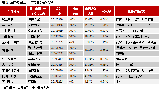 (4)風險提示:貿易業務通常會對弱資質城投公司造成大規模的資金占用,而且利潤極薄,毛利率多在2%以內(見表2)。在風控制度和相關措施不完善的情況下,或者是遭遇周期性經濟下行,貿易業務很可能出現虧損,而且由貿易業務形成的應收賬款還將面臨很大的壞賬風險。