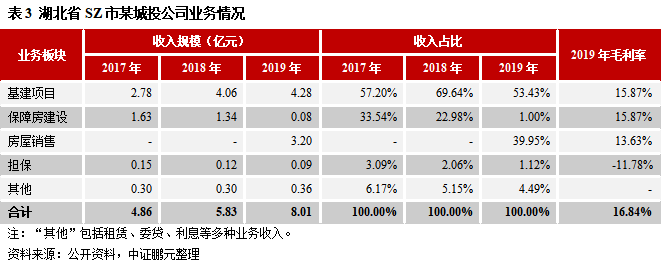 (3)業務情況:公司業務包括基建項目、保障房建設、房屋銷售和擔保四大板塊,其中基建項目、保障房建設均為傳統城投業務,房屋銷售、擔保則屬市場化業務。從事擔保業務的主體為公司之控股子公司,擔保對象主要是當地的中小微企業及個人。2017-2019年,擔保業務收入均值為1212.1萬元,毛利率分別為29.52%、7.66%、-11.78%。雖然擔保業務收入在總營業收入中的占比不高,但由于其毛利率逐年下降,對公司綜合毛利率產生一定拖累。更重要的是,多年來該業務板塊的收入均難以覆蓋擔保代償額,2017-2019年擔保代償額與擔保業務收入的差額均值為551.63億元,代償風險對公司帶來較大的或有負債風險。