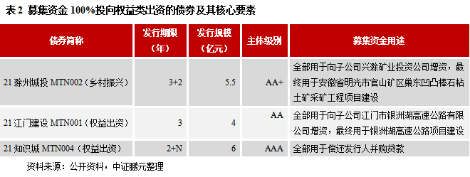 截至11月30日,存量權(quán)益出資型票據(jù)共計34只,規(guī)模336.5億元,其中城投公司發(fā)行的數(shù)量共計21只,規(guī)模190.5億元,共涉及18家發(fā)行主體。在上述18家城投公司中,AAA級、AA+級、AA級的數(shù)量分別為8家、9家、1家,對應(yīng)的權(quán)益出資型票據(jù)存量規(guī)模分別為130億元、56.5億元、4億元,集中在高信用級別的特征尤為顯著。從募集資金用途來看,較多地集中在對子公司增資(并用作項目資本金)、償還并購貸款等,其中有3只債券(為中票)的募集資金100%投向權(quán)益類出資(詳見表2),有12只債券(為中票)中則有部分資金用于償還有息債務(wù),剩余6只債券(為PPN)則未披露募集資金用途。從發(fā)行期限來看,考慮含權(quán)因素的話,最長期限是不確定期限,也即長期存續(xù),但這種情況僅有兩例;不考慮含權(quán)因素的話,最長期限為5年,超八成均為3年期,低于理論預(yù)期水平,顯示投資者對更長期限權(quán)益出資票據(jù)的接受度不高。作為創(chuàng)新品種,其募集資金用于權(quán)益類投資,而權(quán)益類投資本身具有高風(fēng)險性,這與債券投資者低風(fēng)險偏好的特點相悖,這是5年以上甚至長期存續(xù)型權(quán)益出資票據(jù)較難發(fā)出來的根源所在。