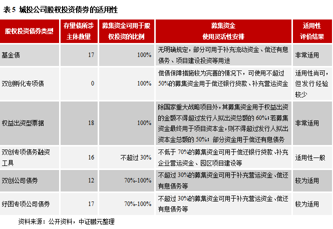 綜上可知,城投公司發(fā)債用于股權(quán)投資,可以選擇發(fā)行包括基金債、雙創(chuàng)孵化專項債、權(quán)益出資型票據(jù)、雙創(chuàng)專項債務(wù)融資工具、雙創(chuàng)公司債券、紓困專項公司債券在內(nèi)的多個品種,但從募集資金用途可用于股權(quán)投資的比例、使用靈活性安排、發(fā)行經(jīng)驗等角度綜合考慮,城投公司若要發(fā)債用于股權(quán)投資,應(yīng)優(yōu)先選擇基金債、權(quán)益出資型票據(jù),其次是紓困專項公司債、雙創(chuàng)公司債券,之后是雙創(chuàng)孵化專項債,最后才是雙創(chuàng)專項債務(wù)融資工具(見表5)。具體來看,除了雙創(chuàng)專項債務(wù)融資工具,其他5類債券的募集資金均可100%用于股權(quán)投資;從資金使用靈活性的角度來看,雙創(chuàng)公司債/紓困公司債<雙創(chuàng)孵化專項債<權(quán)益出資型票據(jù)<雙創(chuàng)債務(wù)融資工具<基金債;從發(fā)行經(jīng)驗豐富程度看,除了尚未有城投公司發(fā)行雙創(chuàng)孵化專項債用于股權(quán)投資外,其他5類債券均有10個以上的主體有過發(fā)行經(jīng)驗,其中權(quán)益出資型票據(jù)、基金債、紓困專項公司債所涉主體最多。鑒于此,本文建議:城投公司發(fā)行股權(quán)投資債券時,應(yīng)優(yōu)先選擇基金債、權(quán)益出資型票據(jù);如果城投公司所進行的股權(quán)投資活動帶有明顯的正外部性,比如支持創(chuàng)新創(chuàng)業(yè)、紓困上市公司等,則應(yīng)優(yōu)先選擇雙創(chuàng)公司債(要求主體或債項評級達到AA+級以上)、紓困專項公司債(要求主體評級達到AA+級以上);此外,如果城投公司主要希望通過發(fā)行創(chuàng)新債券品種以達到簡化審核流程、提高審核效率的目的,同時擬將大部分募集資金用于償債、補流或項目建設(shè)等常規(guī)用途而非用于股權(quán)投資,則應(yīng)優(yōu)先選擇雙創(chuàng)專項債務(wù)融資工具。