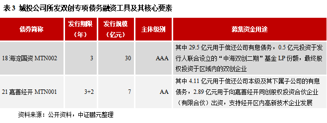 (2)城投公司可以選擇多個債券品種募集資金用于股權(quán)投資:一是基金債,截至目前城投所發(fā)行的存量基金債規(guī)模為255.21億元,共涉及17個主體;二是雙創(chuàng)孵化專項債,截至目前尚未有城投公司發(fā)行此類債券用于股權(quán)投資;三是權(quán)益出資型票據(jù),截至目前城投所發(fā)行的存量債規(guī)模為190.5億元,共涉及18個主體;四是雙創(chuàng)專項債務(wù)融資工具,截至目前城投所發(fā)行的存量債規(guī)模為221.1億元,共涉及16個主體;五是雙創(chuàng)公司債券,截至目前城投所發(fā)行的存量債規(guī)模為102.35億元,共涉及12個主體;六是紓困專項公司債券,截至目前城投所發(fā)行的存量債規(guī)模為397.9億元,共涉及17個主體。