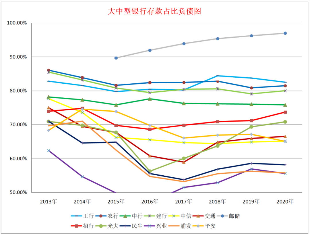 2、存款與負債的比值情況。歷年存款與負債的總平均比維持在70%左右,四大行維持在80%左右,郵儲銀行在90%以上,招商銀行在70-75%之間。民生銀行和浦發銀行這兩年這幾年在資產端出了問題,在負債端也出了問題,存款占比從70%降到55%左右,和同業之王興業銀行一個層次,也是僅有的三家存款占比低于60%的銀行,曾經的小微之王民生銀行和對公之王浦發銀行這幾年經營上確實有些問題,因為各方面的數據都說他們有些問題,興業銀行確實不容易,受監管影響硬生生拉存款。