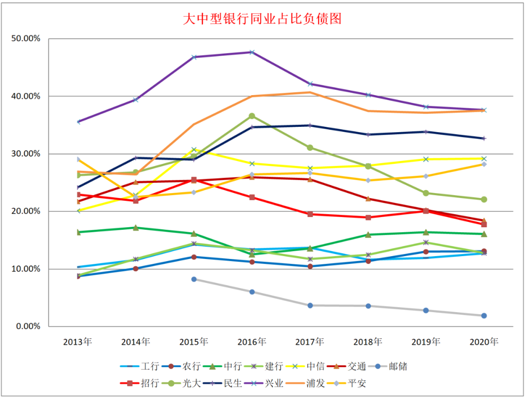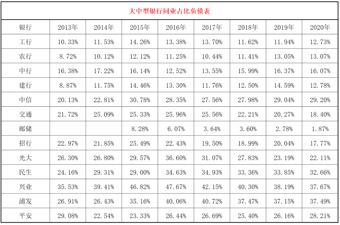 3、同業與負債的比值情況。我們這里統計的同業負債包括同業存放、拆入資金、賣出回購金融資產款和已發行債務證券。郵儲依然幾乎沒有同業負債,四大行占比在10%左右,招商銀行、交通銀行和光大銀行同業負債在20%左右,平安銀行、中信銀行和民生銀行在30%左右,興業銀行和浦發銀行同業負債占比接近總負債的四成。2021年國家政策大概率會偏緊,一個是貨幣緊,一個是監管緊,這兩個都會影響同業負債成本上行,預計今年同業負債占比高的銀行會受影響。