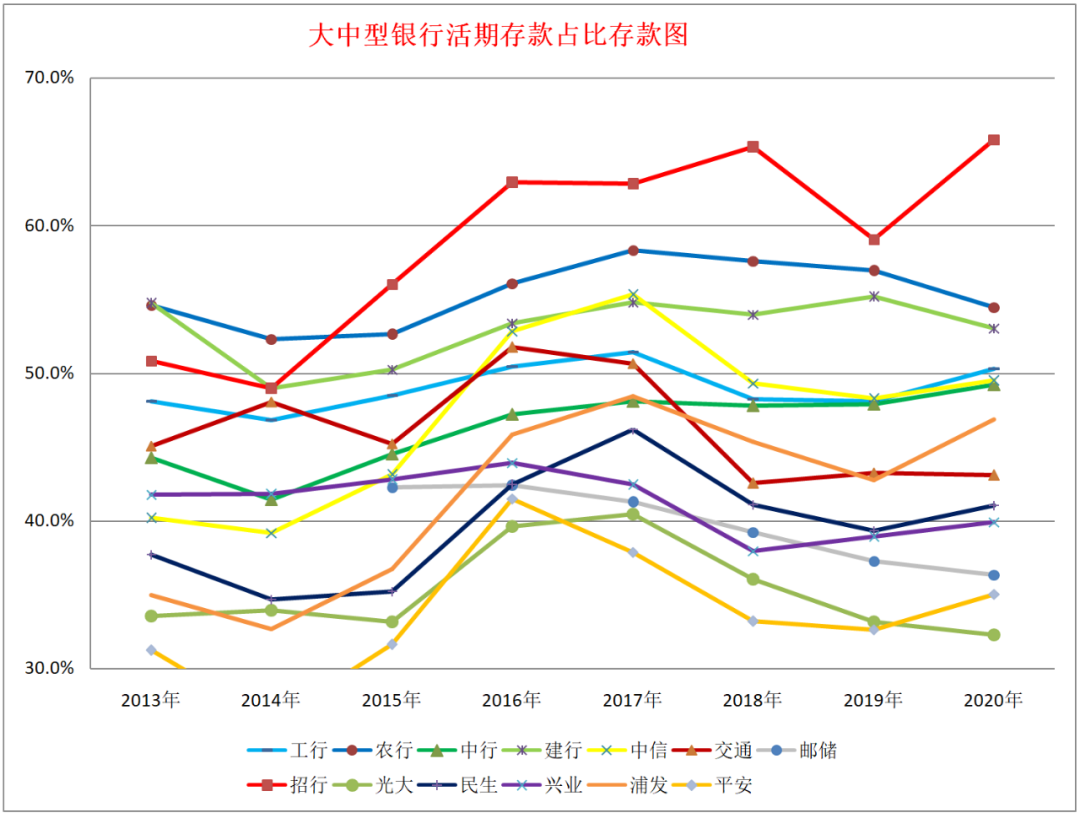 1、總體規律。四大行和郵儲銀行憑借全覆蓋的網點,存款與負債的比值明顯高于其他銀行,負債占比要比其他銀行小得多,其總的存款成本和負債成本相對來說都很低。招商銀行最大的特點是活期存款占比遙遙領先,說明了超強的客戶粘性,這確實是一條護城河。從數據上看,各銀行在負債成本上步調基本一致,銀行的成本受經濟發展和宏觀調控的影響,存款成本2013-2014年上升,2015-2017年下降,2018-2019年上升,2020年下降,預計2021年會保持穩定并略有下降。在負債成本方面,國有大行和招商銀行受政策影響要小一些,股份制銀行受政策影響要大得多。