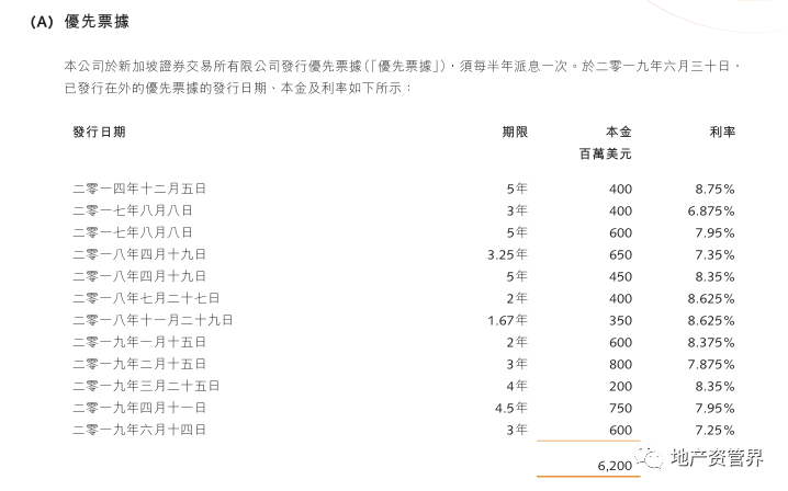 首先,是優先票據。融創于新加坡證券交易所有限公司發行優先票據,截止2019年6月30日,已發行在外的優先票據本金累計為62億美元。據一位新加坡債券從業人士表示,融創的美元債在市場上很搶手,“最近幾筆都是超發,投資者基本要搶額度。而且,相比一些閩系房企,融創的發債利率算是低的。”