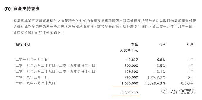 第三,資產支持證券。融創中國全資附屬子公司融創物業服務集團有限公司及融創房地產于第三方融資機構簽訂資產化證券形式的資產支持專項協議。該資產支持證券以收取物業管理服務費和物業銷售款項為資金支持,共計29億元人民幣。